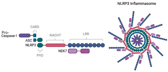 The NLRP3 inflammasome (also referred to as NALP3 or cryopyrin) is a large multimeric protein complex (Figure 1) containing a central nucleotide-binding oligomerisation domain (NACHT), a C-terminus leucine-rich repeat (LRR) and an N-terminal pyrin domain (PYD) [41]. The PYD domain located at the N-terminal of NLRP3 facilitates the recruitment of the apoptosis-associated speck-like protein (ASC) through PYD-PYD interactions [42]. ASC also contains a caspase activation and recruitment domain (CARD) allowing the enlistment of pro-caspase-1 and hence activation into caspase-1 [43]. The NIMA (“never in mitosis gene a”)-related serine/threonine kinase 7 (NEK7) is a scaffolding protein consisting of a catalytic domain that interacts with the LRR domain of NLRP3 [44]. This interaction is proposed to break the inactive NLRP3 cage, transforming it into an active NLRP3 inflammasome disk [45].