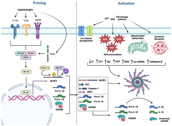 Simplified illustration of the signalling pathway depicting priming and activation of the NLRP3 inflammasome. PAMPs and DAMPs bind to their respective PRRs (IL-1Rs, TLRs, TNFRs, NLRs) to activate NF-κB, which upregulates the genes NLRP3, GSDMD, pro-IL-1β, and pro-IL18 within the cytosol. Concurrently, BRCC3 deubiquitinates NLRP3 and IRAK1/4 phosphorylates NLRP3 to also upregulate the priming of NLRP3 to aid inflammasome formation. Activation of NLRP3 is initiated by ion channel dysregulation, ROS accumulation, mitochondrial dysfunction, and lysosome disruption. Together, these generate key signals, including reduced K+ and increased Ca2+, Na+, ATP, ox-mtDNA, and cathepsin B to activate NLRP3 inflammasome formation. Activated inflammasomes will cleave pro-IL-1β, pro-IL18, and GSDMD to active IL-1β, IL-18, and the N-terminal of GSDMD to initiate pyroptosis.