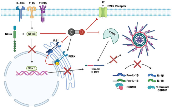 Summary of the identified modulatory effects of CO on NLRP3 formation. CO inhibits NF-κB to reduce transcription of NLRP3 and prevent NLRP3 formation. CO also inhibits P2X receptors to reduce K+ efflux. Retention of K+ is associated with reduced Ca2+-independent phospholipase A2 activation, one of the driving signals for NLRP3 activation [69]. CO inhibits TXNIP to prevent binding of NLRP3 and reduce NLRP3 formation. Lastly, CO activates PERK and inhibits IRE1 phosphorylation to reduce NLRP3 activation.