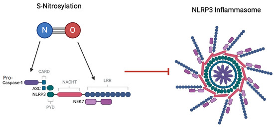 S-nitrosylation inhibition of NLRP3 Inflammasome activation. Post-translational covalent attachment of an NO group (to a cysteine thiol) occurs both at the LRR domain of NLRP3 and on pro-caspase-1 to prevent NLRP3 inflammasome formation.