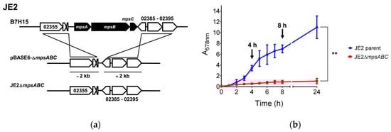 For our phenotypic studies, mpsABC was deleted in the background of a MRSA strain JE2, a well characterized and plasmid-free derivative of S. aureus USA300 LAC []. The deletion of mpsABC in JE2 (ΔmpsABC) (Figure 1a) resulted in an almost complete growth arrest under ambient air conditions (Figure 1b), as previously described for several other S. aureus strains [,]. After 24 h cultivation, the absorption at 578 nm (A578) of JE2ΔmpsABC was <1, whereas the JE2 parent strain reached its stationary phase at an A578 of >10. This growth defect could be rescued by aeration with 5% CO2 (Figure S1). Attempts to isolate a suppressor mutant of JE2ΔmpsABC that thrives under ambient air conditions have failed, consistent with our earlier reports that S. aureus lacks an alternative DICconcentrating mechanism [,,].