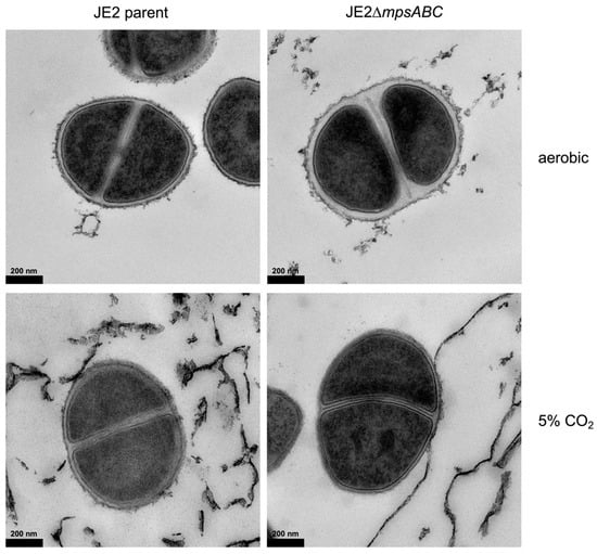 Overnight cultures of S. aureus JE2 and JE2ΔmpsABC (grown in CO2) were inoculated in TSB at a starting A578 of 0.05 and 0.1, respectively. All cultures were grown under their respective conditions with shaking at 37 °C until they reached an A578 of 0.5. An amount of 1 mL aliquots of each culture were collected and pelleted by centrifugation at 1000× g for 10 min before being washed twice with 1 mL of PBS (137 mM NaCl, 2.7 mM KCl, 10 mM Na2HPO4, 1.8 mM KH2PO4, pH 7.3). The cells were pre-fixed with fixing solution (4% formaldehyde, 2.5% glutaraldehyde in 0.1 M PO4 at pH 7.4) for 90 min at room temperature. Cells were high-pressure frozen (HPF Compact 03, Engineering Office M. Wohlwend GmbH) in capillaries and freeze substituted (AFS2, Leica Microsystems GmbH, Wetzlar, Germany) with 2% OsO4 and 0.4% uranyl acetate in acetone as a substitution medium and embedded in Epon. Ultrathin sections were stained with uranyl acetate and lead citrate and analyzed with a Tecnai Spirit transmission electron microscope (Thermo Fisher Scientific, Waltham, MA, USA) operated at 120 kV.
