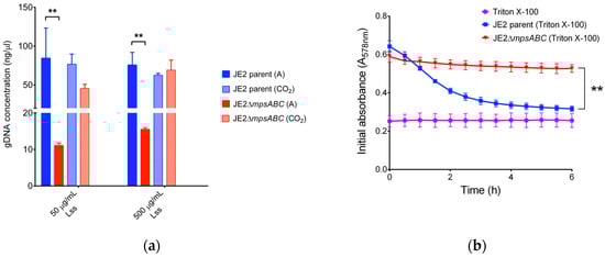 When cells were exposed to CW-degrading lysostaphin, the mutant showed almost a 10-fold lower release of genomic (g) DNA upon cell lysis compared to the parental strain (Figure 3a and Table S1). The mutant also exhibited increased resistance to the non-ionic surfactant Triton X-100, while the same treatment in the parental strain led to a continuous decrease in absorption from A578 0.65 to 0.3 over a 6 h period (Figure 3b).