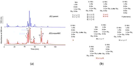 To determine the cause of the increased lysostaphin resistance in the mutant, we analyzed the composition of PG fragments by reversed-phase high-performance liquid chromatography (RP-HPLC) after PG digestion with cellosyl (muramidase from Streptomyces coelicolor), which yields crosslinked and non-crosslinked muropeptides []. PG digestion with cellosyl showed no significant differences in the composition between the JE2 parent and mutant (Figure S3). When PG was double digested with lysostaphin and cellosyl, peaks at a retention time of ~75 min were detected in the mutant profile only (Figure 4a). The muropeptide peaks of the mutant were analyzed by LC-MS and LC-MS/MS (Figure S4). The calculated masses of peak 7, 8, 9, and 12 were consistent with the incorporation of alanine into the pentaglycine interpeptide bridge (Gly5-bridge). Furthermore, peaks 10, 11, and 12 represented dimers that most likely could not be cleaved owing to the restricted activity of lysostaphin (Figure 4b, Table S3). In summary, PG double digestion with lysostaphin and cellosyl detected the incorporation of alanine into the Gly5-bridge (-Glyx-ala-Glyy-), explaining the increased lysostaphin resistance of the mutant. For determination of the PG crosslinking degree, we compared the area distribution of the mono- and oligomeric muropeptide peaks after mutanolysin digestion to the total peak area. The percentage distribution of muropeptides in the mutant did not change with respect to crosslinking compared to the parent strain (Table S2).