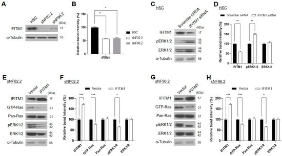 Many studies have reported that the overactivation of Ras/ERK signaling causes tumorigenesis and malignant progression in many tumors [,,,,,]. Thus, the accumulation of GTP-Ras, the active form of Ras, may be an indicator of tumor progression []. We investigated whether IFITM1 expression affects Ras and its downstream ERK1/2 protein levels and activation. As GTP-Ras is undetectable in normal HSCs, the phosphorylation levels of ERK1/2 were evaluated instead. The knockdown of IFITM1 via siRNA treatment of normal HSCs resulted in an increase in phosphorylated ERK1/2 (Figure 2C,D). Conversely, IFITM1 overexpression in the two MPNST Schwann cell lines resulted in a decrease in GTP-Ras and phosphorylated ERK1/2 in both sNF02.2 (Figure 2E,F) and sNF96.2 (Figure 2G,H) cells. These results suggest the close involvement of IFITM1 in the regulation of the Ras/ERK signaling pathway, which is involved in NF1 pathogenesis.
