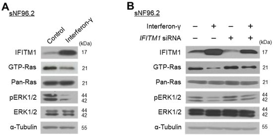 Effect of interferon-gamma (IFN-γ) treatment on IFITM1 expression and Ras signaling-associated protein levels and activation in malignant peripheral nerve sheath tumor (MPNST) cells. (A) NF1-associated MPNST NF96.2 cells were treated with IFN-γ (1000 U/mL) for 3 h and protein levels were assessed via Western blotting. (B) sNF96.2 cells were transfected with IFITM1 siRNA (50 nM) for 72 h with (+) or without (−) additional treatment with IFN-γ (1000 U/mL) for 3 h. The negative symbol (−) for IFN-γ indicates a distilled water treatment, while that for IFITM1 siRNA indicates a scrambled siRNA treatment (50 nM). The levels of IFITM1, GTP-Ras, Pan-Ras, phosphorylated ERK1/2 (pERK1/2), ERK1/2, and α-tubulin were assessed via Western blotting.
