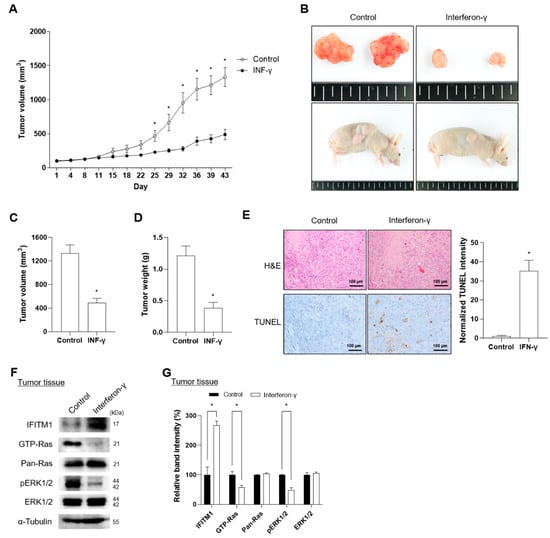 Xenograft mice were successfully generated via injection of S462 cells and were confirmed based on tumor shape, volume, and weight (Figure 4A–D). IFN-γ was subcutaneously injected thrice a week for four weeks. The body weight did not differ between the nontreated control and IFN-γ-treated groups during the observation period, including receipt, final quarantine, transplantation, and group assignment day (Supplementary Figure S2). Notably, IFN-γ treatment successfully suppressed tumor volume during days 25 to 43 of transplantation (Figure 4A). At the end of IFN-γ treatment, tumor tissues were dissected, and tumor volume and weight were measured. After 43 d of treatment, IFN-γ-treated tumor tissues presented a 2.7-fold decrease in tumor volume and a 3.1-fold reduction in tumor weight compared with nontreated control tissues (Figure 4B–D). Tumor progression status was histologically evaluated via H&E staining for necrosis of tumor cells and TUNEL assay for apoptosis of tumor cells. IFN-γ treatment showed significantly increased TUNEL-positive cells in tumor tissues; however, in H&E staining, no difference was found in single and contiguous cells between the control and IFN-γ-treated groups, indicating that IFN-γ induced apoptosis rather than necrosis (Figure 4E). Consistent with in vitro results, IFN-γ treatment increased IFITM1 expression and decreased GTP-Ras and phosphorylated ERK1/2 (Figure 4F,G).