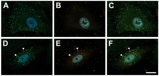 Galectin-1 colocalizes with PDGF-Rβ in PDGF-BB-induced clustering. Immunohistochemical staining for PDGF-Rβ (green) and galectin-1 (orange) of human RPE cells after incubation with 20 ng/mL PDGF-BB (A–C) or a combination of 20 ng/mL PDGF-BB and 10 µg/mL hr-galectin-1 (D–F) for 30 min. Arrow heads, colocalization of galectin-1 with PDGF-Rβ; blue, DAPI staining; scale bar, 20 µm.