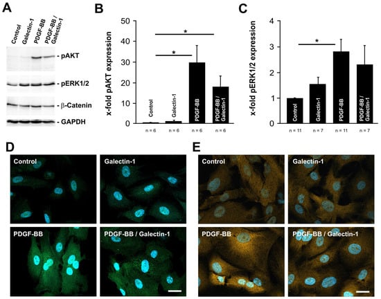 PDGF-BB-induced AKT and ERK1/2 signaling is reduced by hr-galectin-1. (A–C). Western blot analysis (A) and densitometry (B,C) for pAKT, pERK1/2 and β-catenin of human RPE cells after treatment with 10 µg/mL hr-galectin-1 and/or 20 ng/mL PDGF-BB for 30 min. Mean ± SEM; * p < 0.05. (D,E) Representative immunohistochemical staining against pAKT (D) and pERK1/2 (E) of human RPE cells after incubation with 10 µg/mL hr-galectin-1 and/or 20 ng/mL PDGF-BB for 30 min. Blue, DAPI staining; scale bar, 50 µm.