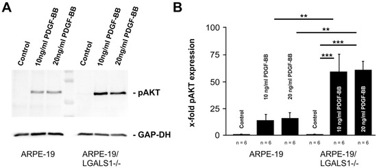 Following treatment of wild-type ARPE-19 cells with 10 and 20 ng/mL PDGF-BB, an increased signal for pAKT was observed, which was 14.3 ± 7.2- and 15.5 ± 7.8-fold, respectively, when compared to untreated controls (Figure 4A,B). In galectin-1-deficient ARPE-19 cells, however, the increase in pAKT following PDGF-BB treatment with 10 and 20 ng/mL was even more marked, with a 58.9 ± 16.6- and 60.8 ± 8.9-fold enhancement, respectively, compared to untreated ARPE-19/LGALS1−/− cells (n = 6; p = 0.0003 for 10 and 20 ng/mL; Figure 4A,B). Compared with PDGF-BB-treated wild-type controls, the pAKT signal was approximately 4 times higher in ARPE-19/LGALS1−/− cells, which was a statistically significant difference (p = 0.0059 for 10 ng/mL; p = 0.0083 for 20 ng/mL; Figure 4A,B). Overall, our data strongly suggest that the lack of galectin-1 leads to enhanced pAKT signaling following PDGF-BB treatment.
