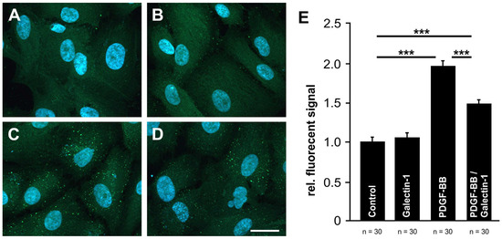 Galectin-1 reduces PDGF-BB-mediated clustering of PDGF-Rβ. (A–D). Immunohistochemical staining for PDGF-Rβ (green) of untreated human RPE cells (A) and after incubation with 20 ng/mL PDGF-BB (B), 10 µg/mL hr-galectin-1 (C) and a combination of 20 ng/mL PDGF-BB and 10 µg/mL hr-galectin-1 (D) for 30 min. Blue, DAPI staining; scale bar, 30 µm. (E). For quantification, the fluorescent signal was analyzed and plotted as relative fluorescent signal in relation to the control group. Mean ± SEM of three independent experiments; *** p < 0.001.