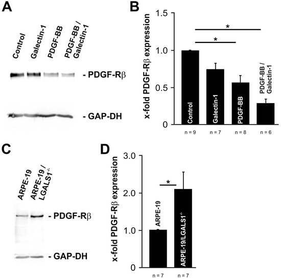 Vice versa, in immortalized galectin-1-deficient ARPE-19 cellsthe protein expression levels for PDGF-Rβ were significantly higher (2.1- ± 0.5-fold, p < 0.032) compared to wild-type controls (Figure 6C,D). Overall, our data strongly suggest that both exogenously added and endogenously expressed galectin-1 has the distinct potential to downregulate the protein expression of PDGF-Rβ.