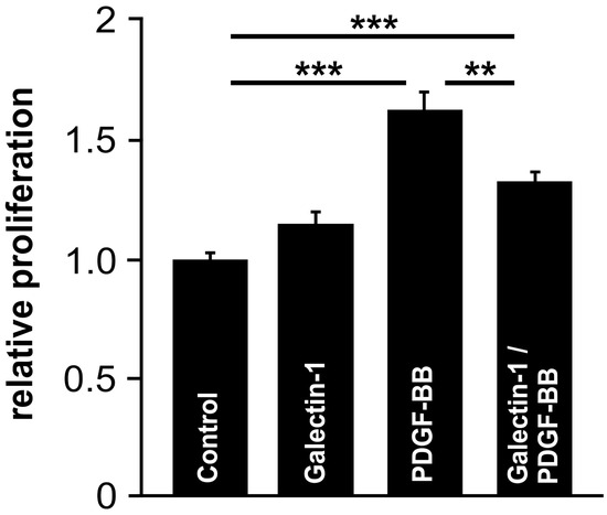 Following incubation of cells with hr-galectin-1 alone, a slight increase in cell proliferation was observed, while the treatment of RPE cells with PDGF-BB for 24 h led to an increased proliferation of 62.7 ± 7.4% (p < 0.001) compared to untreated controls (Figure 7). However, the PDGF-BB-mediated proliferative effect was reduced to 32.2 ± 4.6% when cells were additionally incubated with hr-galectin-1—an effect that was statistically significant (p < 0.01; Figure 7). Overall, our data strongly suggest that galectin-1-induced inhibition of PDGF-BB signaling leads to cell biological effects, such as reduced proliferation of RPE cells.