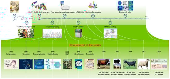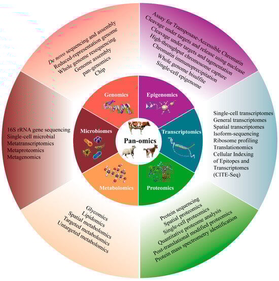 In recent years, the era of pan-omics has emerged, integrating genomics, transcriptomics, proteomics, epigenomics, metabolomics, and microbiomics to transcend the boundaries between different types of information, thus obtaining more comprehensive biological insight [,]. Compared to single-omics research, pan-omics better elucidates the flow of information from genetics and environment to functional outcomes. As significant livestock, the genetic background and metabolic characteristics of ruminants are crucial for production performance []. In this context, this review summarizes the development, methods, advantages, and applications of various single-omics and pan-omics technologies in ruminants, aiming to provide references for studying important economic traits in ruminants.