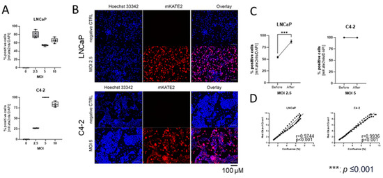Establishment of prostate cancer (PCa) cell lines expressing mKATE2-NLS. (A) LNCaP and C4-2 cells were transduced with a MOI of 2.5, 5, and 10. Positive cells were detected using the Keyence microscope and analysed with the BZ-X800 Analyzer software. The graphical illustration of the mKATE2-NLS positive cells for each cell line was plotted as a box and whisker plot (min to max) of the six technical replicates. (B) Representative pictures of each cell line before blasticidin selection are shown of the chosen MOI compared with the untransduced cells (negative CTRL). The scalebar represents 100 μm. (C) Analysis of positive cells before and after blasticidin selection. mKATE2-NLS positive cells were detected using the BZ-X800 microscope (Keyence GmBH, Neu-Isenburg, Germany) and analysed with the BZ-X800 Analyzer software (Keyence GmbH). The graphical illustration of the mKATE2-NLS positive cells for each cell line was plotted as the mean ± SD of six technical replicates. An unpaired student’s T-test was used to detect significant differences. p-values ≤ 0.05 were considered significant. ***: p ≤ 0.001. (D) Correlation analysis of cell number determined by mKATE2 counting and cell confluence using the S3 Incucyte Live-Cell Analysis System (Sartorius AG, Göttingen, Germany). Cell lines were seeded in triplicates into 96-well plates, and confluence and mKATE2-NLS numbers were determined for 5 days. Pearson correlation (r) was calculated using Prism software (Boston, MA, USA).
