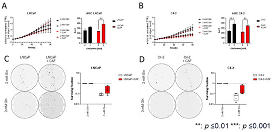 To assess the impact of CAFs on Gln deprivation in LNCaP and C4-2 cells, the cell lines were grown in the presence and absence of CAFs and Gln (0 mM and 2 mM) for 96 h. Changes in PCa cell proliferation were determined by mKATE2-NLS positive nuclei counting using the S3 Incucyte Live-Cell Analysis System (Sartorius AG, Göttingen, Germany), and changes in proliferation rates were displayed as changes in AUC (Figure 2A,B and Figure S1C), as suggested by Duan et al. [34]. Co-culturing LNCaP cells with CAF cells significantly increased the proliferation of LNCaP cells (Figure S1A), whereas the C4-2 cell’s proliferation (Figure S1B) was not affected by CAFs (Figure S1C). Without CAFs, Gln deprivation had a negligible effect on LNCaP proliferation (Figure 2A). In the presence of CAFs, Gln deprivation significantly reduced cell proliferation. However, the growth rate of C4-2 cells was significantly reduced regardless of the presence or absence of CAFs (Figure 2B). In addition to proliferation assays, clonogenic assays were performed to study the influence of CAFs on Gln deprivation on the ability of a single LNCaP or C4-2 cell to grow into a colony (Figure 2C,D). The analysis revealed that CAFs increased the CFE of both cell lines (Figure S1D). Moreover, the CFE-reducing effects of the Gln deprivation on LNCaP (Figure 2C) and C4-2 cells (Figure 2D) were diminished by CAF cells.