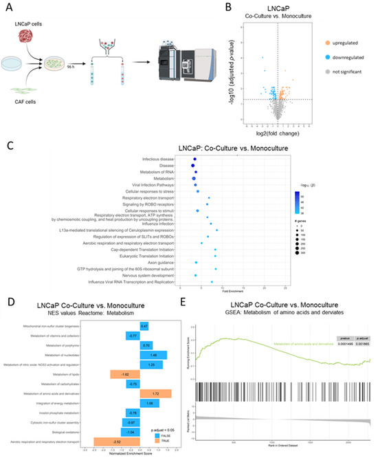 PathfindR and GSEA analysis results for differentially expressed genes after co-culturing LNCaP and CAF cells. (A) Graphical representation of the experimental procedure. Created with BioRender.com (accessed on 26 August 2023). LNCaP mKATE2-nls cells (1 × 106) and CAF eGFP-nls cells (5 × 105) were seeded into a 10 cm2 dish and cultured for 96 h. The different cells were then sorted and monocultured and the sorted cells were lysed for mass spectrometry. (B) Volcano plot of differentially expressed proteins in LNCaP cells after co-culturing the cells for 96 h with CAFs. Colour coding: gray = no statistically significant difference and not differentially expressed; blue = statistically significantly downregulated proteins, red = statistically significantly upregulated proteins. (C) The top 20 enriched pathways were identified by “pathfindR” pathway analysis using Reactome pathways, ordered by −log10(Padj) in LNCaP cells after co-culturing the cells for 96 h with CAF cells. (D) Selected metabolic gene sets enriched in co-cultured LNCaP cells using the REACTOME database. (E) Selected GSEA plots of metabolism of amino acids and derivates for LNCaP cells co-cultured with CAF.