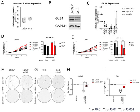 Gln is a non-essential amino acid that makes its removal from the body impossible. Several inhibitors have been developed to target Gln metabolism, of which the selective GLS1 inhibitor CB839 is the most promising [12,35,36,37]. Therefore, the influence of CAFs on the inhibitory effects of CB-839 cells on LNCaP and C4-2 cell proliferation and clonogenic potential was examined (Figure 4). To ensure that both cell lines expressed the therapeutic target structure of CB839, the expression of GLS1 in LNCaP and C4-2 cells was analysed using qPCR and Western blotting. Both cell lines showed comparable expression levels of GLS mRNA (Figure 4A) and GLS1 protein (Figure 4B,C). To assess the influence of CAFs on the effects of CB-839, cell lines were cultured in the presence or absence of CAFs and CB-839 for 96 h (Figure 4D,E). As shown previously, CB-839 treatment led to a minor reduction in LNCaP cell proliferation without CAFs.