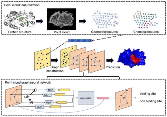 Unlike traditional grid or image representations, point cloud representations intuitively capture the geometric features of protein surfaces, such as surface concavity and curvature []. In addition, point clouds can flexibly adapt to the various complex shapes of protein surfaces without being limited to a fixed resolution. This flexibility has made them highly successful in tasks such as protein–ligand affinity and protein–protein binding site prediction [,,]. Graph neural networks (GNNs) [] are a crucial component of GDL. GNNs capture local structural information between points by constructing neighborhood graphs, which helps to identify specific structural features near binding sites. More importantly, a GNN can better handle the rotational and translational invariance of proteins, which is essential for accurate binding site prediction [,,].