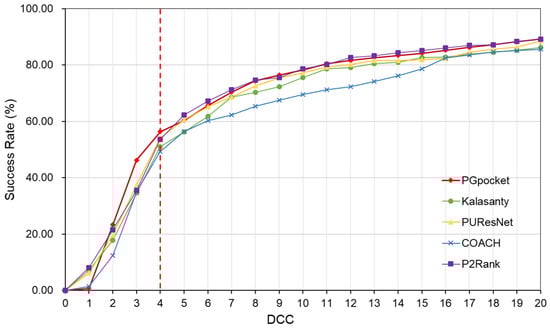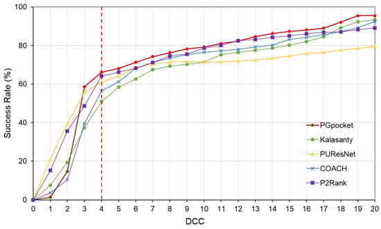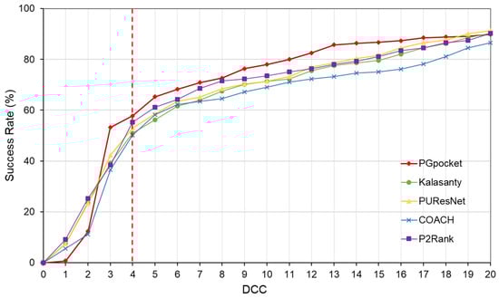 Success rate plot of different DCC values for PGpocket and the baselines on scPDB dataset. The red dotted line represents the performance of the 5 frameworks when DCC is less than or equal to 4 Å.