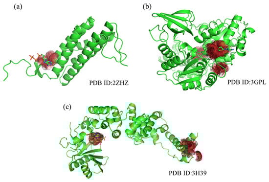 Protein structures (2ZHZ, 3GPL, 3H39) from Coach420, showing predicted binding sites by PGpocket (Red Region). (a), PGpocket prediction results on structure 2ZHZ. (b), PGpocket prediction results on structure 3GPL. (c), PGpocket prediction results on structure 3H39.
