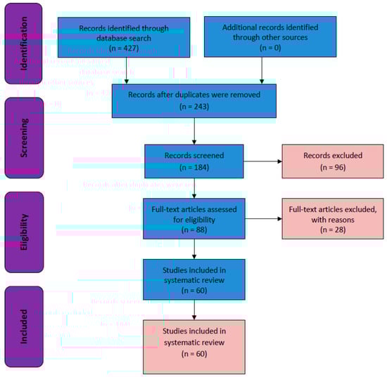 This systematic review was conducted in accordance with the Preferred Reporting Items for Systematic Reviews and Meta-Analysis criteria (Figure 1). A systematic search for eligible studies in the EMBASE, MEDLINE (via PubMed), and CENTRAL (via the Cochrane Library) databases was conducted from 2013 to 2023 (Figure 2). A total of 427 articles were screened, and among them, 184 non-duplicate publications were identified. We excluded 96 publications after screening titles and abstracts and another 28 published papers after full-text screening. Finally, the remaining 60 eligible randomized controlled trials (RCTs)/CTs were included in this systematic review.