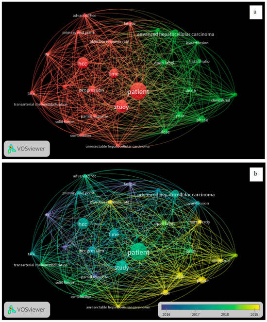 Visualization of bibliometric networks of eligible articles using VOSviewer version 1.6.16 software (n = 60): (a) network visualization and (b) overlay visualization.
