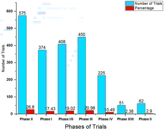 The global pharmaceutical companies are steadily manufacturing new and novel molecules in the form of drugs for treatment of hepatocellular carcinoma during past decades. These industries considered Asia–Pacific, North America and Europe as the leading areas for their drug trials []. There are several pharmaceutical industries sponsor sites in these regions including Sun Yat-sen University, National Cancer Institute US, FUDAN University and Eastern Hepatobiliary Surgery Hospital. These drug trials for hepatocellular carcinoma (Phase 0 to Phase IV) were sponsored by the company itself in collaboration with the governments, individuals or institutions (Table 2; Figure 5). There are numerous drugs available in the market of USA and Europe to treat hepatocellular carcinoma, which includes pembrolizumab (Keytruda), nivolumab (Opdivo, Opdyta) and bevacizumab (Avastin) []. Pembrolizumab (Keytruda) is marketed for the treatment of hepatocellular carcinoma in USA and Europe and is an antineoplastic immunomodulating molecule that antagonist mechanism on Programmed Cell Death Protein 1 (PD1 or CD279 or PDCD1). It was first commercially approved in the year 2014 and launched in the markets of the US, the UK, Australia, France, and Germany by Merck & Co. Inc. and its subsidiaries (Rahway, NJ, USA). Another drug named nivolumab (Opdivo,  Opdyta) performs antagonist action on Programmed Cell Death Protein 1 (PD1 or CD279 or PDCD1) and is a human IgG4 anti PD-1 monoclonal antibody that treats hepatocellular carcinoma. This drug was first approved in the year 2014 and launched in the market of the US, the UK, Australia, France and Germany by Bristol Myers Squibb Co and its subsidiaries []. According to global data, 26.80% of the clinical trials are Phase II, 20.98% are Phase III, 19.02% Phase I/II, 17.43% Phase I, while Phase II/III and Phase 0 comprised 2.38 and 2.90%, respectively (Table 2).