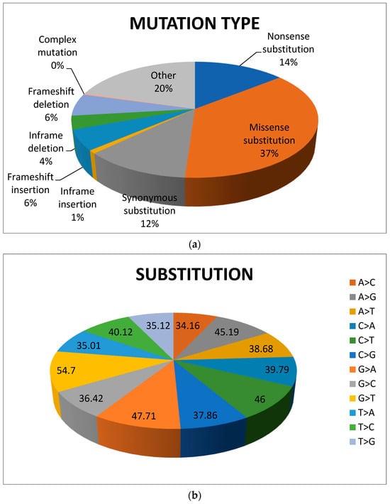 Pie chart showing (a) mutation and (b) substitution in HCC (data source: https://cancer.sanger.ac.uk/cosmic  (accessed on 8 February 2024) (Ref. []).