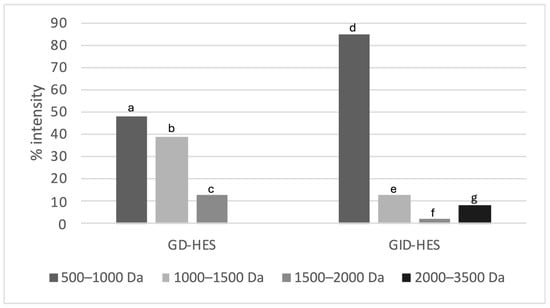 Peptide mass distribution (% intensity) in the gastric and gastrointestinal digests from Erythrina edulis (chachafruto) seed protein concentrate hydrolyzate (HES) (GD-HES, GID-HES). Different superscript letters indicated statistical differences.