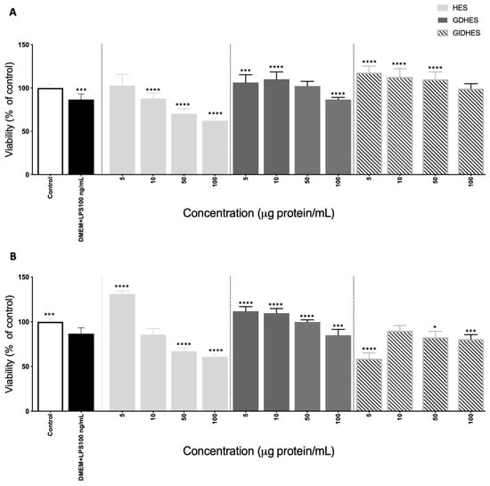 Viability (expressed as % of control considered as 100%) of (A) basal RAW264.7 macrophages and (B) lipopolysaccharide (LPS)-stimulated RAW264.7 macrophages after 24 h incubation with different concentrations (5–100 μg protein/mL) of undigested and digested chachafruto seed protein concentrate hydrolyzate by Alcalase (HES, GD-HES, and GID-HES). Significant differences compared to the (A) control or (B) LPS (* p < 0.05; *** p < 0.001; **** p < 0.0001).