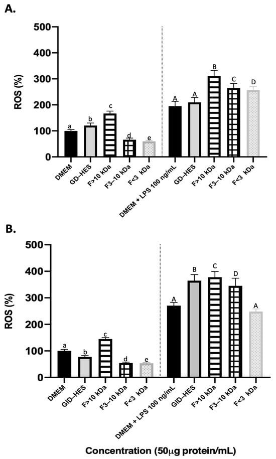 Reactive oxygen species (ROS) are molecules that are biologically produced during cell metabolism and are involved in cell proliferation and survival. However, the accumulation of ROS may be driven by outside stimuli, such as environmental factors, that cause an imbalance in their production and removal from cells antioxidative systems. This may lead to damage to the cells by oxidative stress [41]. Natural peptides have garnered attention as antioxidants because of their notable effectiveness and minimal toxicity [42]. Thus, exploring the potential of natural peptides to ameliorate diseases caused by oxidative damage represents a promising opportunity for further investigation. After food consumption, gastrointestinal enzymes have been found to aid in the production of antioxidant peptides [43,44]. However, there is a lack of studies on the bioactivity of peptides produced from simulated gastrointestinal digestion and the possible effect of prior hydrolysis by proteases. In this study, to assess the impact of peptides derived from GD-HES and GID-HES on cellular oxidative status, the levels of ROS were measured. Figure 5 summarizes the results obtained in the generation of ROS when macrophage cells under basal and stimulated conditions were exposed to GD-HES (Figure 5A) and GID-HES (Figure 5B) and their respective fractions.