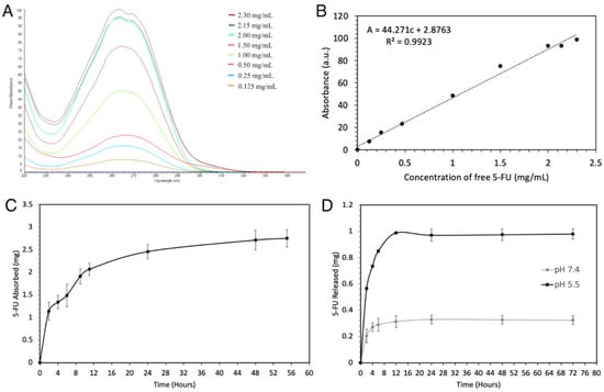 A 5-FU stock solution was prepared and diluted to yield various concentrations, and the UV–visible absorbance of each solution was analyzed at λ = 260 nm. The results were plotted against their respective concentrations to yield a basis of comparison for future UV-vis experiments.