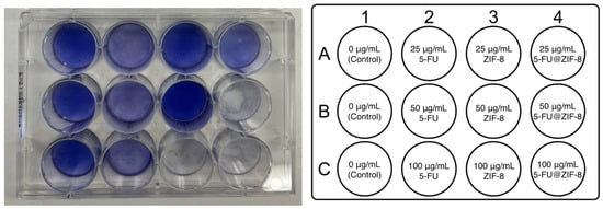 The in vitro cytotoxicity of 5-FU, ZIF-8, and 5-FU@ZIF-8 was assayed against SCC7 cells and visualized via a nuclear staining technique. Each treatment was conducted in triplicate. The prepared SCC7 cells were passed to a 12-well tissue culture plate at a density of 8.0 × 105 cells per well and incubated overnight at 37 °C and 5% CO2. 5-FU, ZIF-8, and 5-FU@ZIF-8, which were autoclaved for 90 min at 120 °C to ensure sterility, were added to the culture medium at concentrations of 25 μg/mL, 50 μg/mL, and 100 μg/mL. The drug-incorporated media were then added to the wells to replace the original culture media. After 72 h of incubation, the drug-incorporated media were removed, and 1 mL toluidine blue stain was added to each well. The plate was placed on an orbital shaker for 8 h, after which the dye was suctioned out and the wells were washed with PBS and air-dried for 24 h.