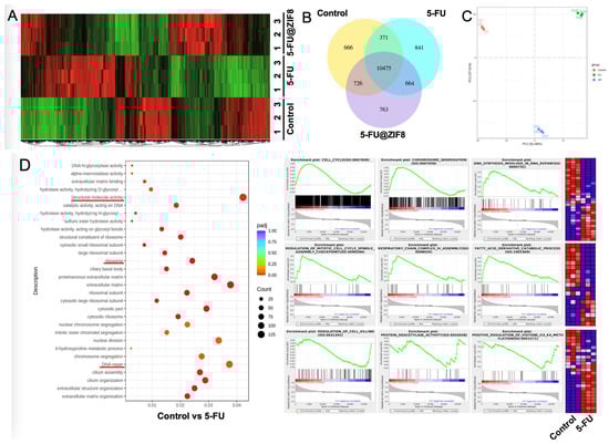 The prepared SCC7 cells were passed to a 6-well tissue culture plate and incubated overnight at 37 °C and 5% CO2. 5-FU and 5-FU@ZIF-8 were added to the culture medium at 50 μg/mL. For each group, this process was performed in triplicate. After 72 h, the cells were detached with trypsin and centrifuged. The supernatant was discarded, and the remaining cell pellet was frozen at −20 °C. Each sample group was prepared for RNA extraction using the QIAzol Lysis Reagent protocol, and subsequent sample analysis was conducted by Novogene.
