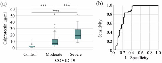 - Gatselis, N.K.; Lyberopoulou, A.; Lygoura, V.; Giannoulis, G.; Samakidou, A.; Vaiou, A.; Antoniou, K.; Triantafyllou, K.; Stefos, A.; Georgiadou, S.; et al. Calprotectin serum levels on admission and during follow-up predict severity and outcome of patients with COVID-19: A prospective study. Eur. J. Intern. Med. 2023, 122, 78–85. [Google Scholar] [CrossRef]