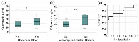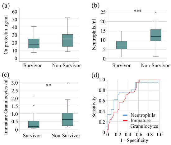 - Jonsson, N.; Nilsen, T.; Gille-Johnson, P.; Bell, M.; Martling, C.R.; Larsson, A.; Mårtensson, J. Calprotectin as an early biomarker of bacterial infections in critically ill patients: An exploratory cohort assessment. Crit. Care Resusc. 2017, 19, 205–213. [Google Scholar] [CrossRef] [PubMed]