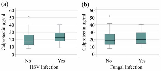 2.7. Relationship of Serum Calprotectin to Bacterial and Fungal Superinfections and HSV Reactivation