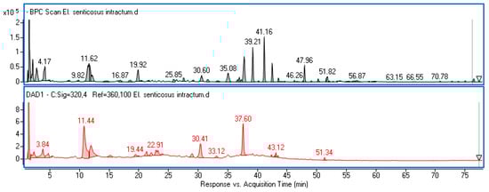 Base peak chromatogram (grey line) and the chromatogram registered at λ = 320 nm (red line) of E. senticosus fruit intractum.