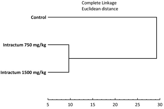 Hierarchical cluster analysis (Figure 6) indicates that there are similarities in the health profile of mice administered intractum at doses of 750 mg/kg and 1500 mg/kg. Both the 750 mg/kg and 1500 mg/kg doses caused comparable effects in the studied parameters. Simultaneously, the dendrogram shows a distinct difference between the parameters of mice given intractum and the control group.