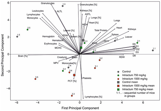 Principal component analysis (Figure 7) based on all studied parameters indicates a separation of the mean values of the three studied groups of mice. However, the parameters for individual specimens from the group administered intractum at 750 mg/kg and mice from the control group overlap. This may suggest that the 750 mg/kg dose does not introduce significant changes in the profile of the studied parameters compared to the control group. The group of mice given intractum at 1500 mg/kg appears to be more separated from the others, especially from the control group, indicating that intractum administration at this concentration has a greater impact on the tested parameters than the 750 mg/kg concentration.