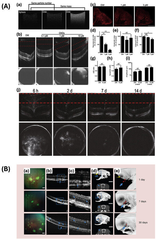 - Song, H.B.; Wi, J.-S.; Jo, D.H.; Kim, J.H.; Lee, S.-W.; Lee, T.G.; Kim, J.H. Intraocular Application of Gold Nanodisks Optically Tuned for Optical Coherence Tomography: Inhibitory Effect on Retinal Neovascularization without Unbearable Toxicity. Nanomed. Nanotechnol. Biol. Med. 2017, 13, 1901–1911. [Google Scholar] [CrossRef] [PubMed]
