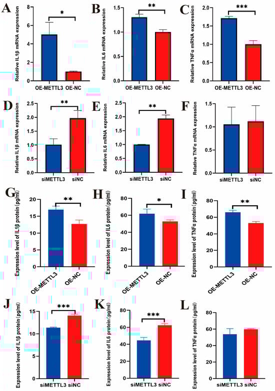 The mRNA expression levels of cytokines IL1β, IL6, and TNFα in IECs after LPS induced overexpression of METTL3 (A–C). Protein expression levels of cytokines IL1β, IL6, and TNFα in IECs after LPS induced overexpression of METTL3 (D–F). The mRNA expression levels of cytokines IL1β, IL6, and TNFα in IECs after LPS induced interference with METTL3 (G–I). Protein expression levels of cytokines IL1β, IL6, and TNFα in IECs after LPS induced interference with METTL3 (J–L). The data are presented as means ± SEM (standard error of the mean) (n = 3). The statistical significance was assessed using the unpaired Student’s t-test. (Unmarked: p > 0.05; * p < 0.05; ** p < 0.01; *** p < 0.001).