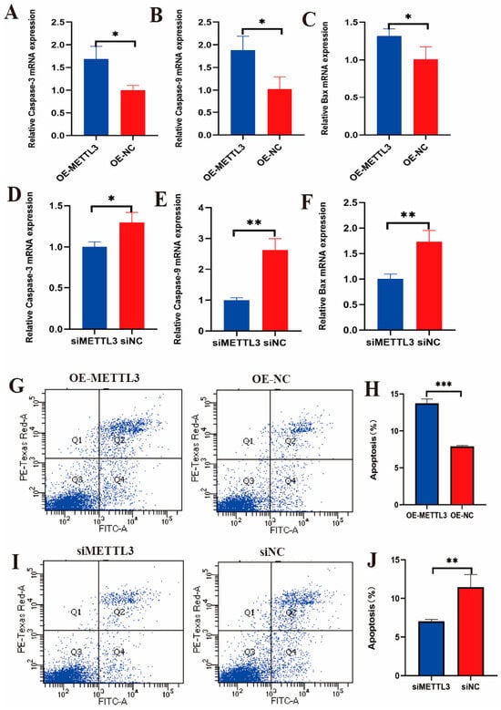 The qRT-PCR results showed that overexpressing METTL3 in LPS-induced IECs significantly upregulated the apoptosis marker genes Caspase-3, Caspase-9, and Bax (Figure 6A–C). Conversely, after LPS induction and interference with METTL3 expression in IECs, the apoptosis marker genes Caspase-3, Caspase-9, and Bax were significantly downregulated (Figure 6D–F). Additionally, flow cytometry results demonstrated that in LPS-induced IECs overexpressing METTL3, the cell apoptosis rate was significantly increased (Figure 6G,H). In contrast, after LPS induction in IECs with METTL3 interference, the cell apoptosis rate was significantly decreased (Figure 6I,J). These results suggest that METTL3 promotes apoptosis in IECs.