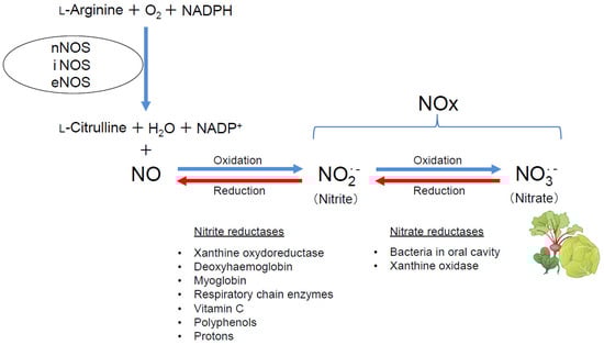 Schematic diagram showing the chemical reactions catalyzed by NOSs. NO is synthesized from L-arginine, oxygen, and NADPH by NOSs along with generation of L-citrulline, water, and NADP+. NO is oxidized to nitrite (NO2−), and, in turn, to nitrate (NO3−). Nitrate is rich in green leafy vegetables, such as beetroot, lettuce, and spinach. Nitrate is reduced to nitrite by bacteria in the oral cavity and xanthine oxidase, and nitrite is reduced to NO by xanthine oxidoreductase, deoxyhemoglobin, myoglobin, respiratory chain enzymes, vitamin C, Polyphenols, and protons.