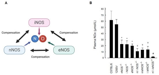 Compensatory interactions among each NOS isoform (A) and plasma NOx levels in triple-n/i/eNOSs-KO mice (B). (A) Schematic diagram showing compensatory interactions among each NOS isoform. (B) Plasma NOx levels in wild-type C57BL/6 and 129SV, single-nNOS-KO, -iNOS-KO, -eNOS-KO, double-n/iNOSs-KO, -n/eNOSs-KO, -i/eNOSs-KO, and triple-n/i/eNOSs-KO mice. * p < 0.05, # p < 0.01, † p < 0.001 vs. C57BL/6. Data from [28]. Copyright 2005 National Academy of Sciences.