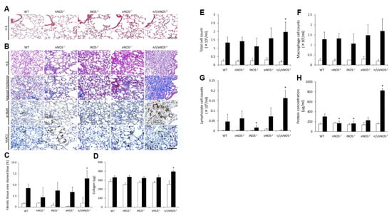 Deterioration of pulmonary fibrosis and increased inflammatory cell number in the bronchoalveolar lavage fluid in triple-n/i/eNOSs-KO mice at 2 weeks after bleomycin treatment. (A) Hematoxylin–eosin (H.E) staining in normal saline-treated mice. Scale bar = 100 μm. (B) Hematoxylin–eosin staining, Masson’s trichrome staining, α-smooth muscle actin (SMA) staining, MAC-2 staining in bleomycin-treated mice. Scale bar = 100 μm. (C) Fibrotic tissue area (blue-stained). (D) Collagen content in lung tissues. White and black bars indicate normal saline-treated (n = 3) and bleomycin-treated mice (n = 5), respectively. * p < 0.05 vs. bleomycin-treated WT mice. (E–H) Total, macrophage, and lymphocyte cell counts and total protein concentrations in the bronchoalveolar lavage fluid. White and black bars indicate normal saline-treated (n = 3) and bleomycin-treated mice (n = 5), respectively. * p < 0.05 vs. bleomycin-treated WT mice. Data from [33].