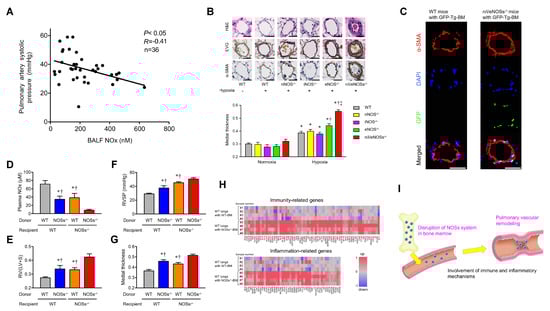 The protective role of NO derived from myelocytic NOSs in chronic hypoxia-induced pulmonary hypertension in mice. (A) An inverse correlation between pulmonary artery systolic pressure and NOx (nitrite plus nitrate) levels in bronchoalveolar lavage fluid in patients with idiopathic pulmonary fibrosis. Pulmonary artery systolic pressure estimated by Doppler echocardiography was significantly and negatively correlated with NOx concentrations in bronchoalveolar lavage fluid in patients with idiopathic pulmonary fibrosis. Statistical analysis was performed using the Pearson correlation coefficient. BALF, bronchoalveolar lavage fluid. (B) Hematoxylin and eosin staining, elastic van Gieson staining, and α-smooth muscle actin staining of small pulmonary arteries. Scale bar = 50 μm. Medial thickness of small pulmonary arteries (50–150 µm in diameter) (n = 5–10). Statistical analyses were performed by an ANOVA followed by Bonferroni’s post hoc test for multiple comparisons. * p < 0.05 vs. normoxia; † p < 0.05 vs. wild type; ‡ vs. eNOS−/−. H&E, hematoxylin and eosin staining; EVG, elastic van Gieson staining; α-SMA, α-smooth muscle actin staining. (C) Immunofluorescent staining in the lungs of wild-type and triple-n/i/eNOSs−/− mice transplanted with bone marrow cells isolated from green-fluorescent-protein-transgenic mice after chronic hypoxic exposure. Green-fluorescent-protein-positive green fluorescence and green fluorescent protein/α-smooth-muscle-cell-double-positive white fluorescence were observed (n = 5). Scale bars = 50 μm. DAPI, 4′,6-diamidino-2-phenylindole (nuclear staining); GFP, green fluorescent protein; α-SMA, α-smooth muscle actin. (D–G) Plasma NOx levels (D), weight ratio of the right ventricle to the left ventricle plus the interventricular septum (RV/[LV + S]) (E), right ventricular systolic pressure (RVSP) (F), and medial thickness of small pulmonary arteries (50–150 µm in diameter) (G) after chronic hypoxic exposure (n = 5–6). Statistical analyses were performed by an ANOVA followed by Bonferroni’s post hoc test for multiple comparisons. * p < 0.05 vs. wild-type mice transplanted with wild-type bone marrow cells; † p < 0.05 vs. triple-n/i/eNOSs−/− mice transplanted with triple-n/i/eNOSs−/− bone marrow cells. (H) Heat maps of differentially expressed mRNAs categorized as immunity and inflammation in the Subio platform. RNA sequencing was performed to obtain the data. (I) A schematic diagram showing the protective role of NO derived from myelocytic NOSs in chronic hypoxia-induced pulmonary hypertension. Data from [6]. Reprinted with permission of the American Thoracic Society. Copyright© 2024 American Thoracic Society. All rights reserved. The American Journal of Respiratory and Critical Care Medicine is an official journal of the American Thoracic Society.