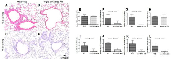Pathological findings and cytokine and chemokine mRNA expression levels in the lungs of WT and triple-n/i/eNOSs-KO mice that were sensitized and challenged with ovalbumin (OVA). (A–D) Hematoxylin and eosin staining of lung sections from wild-type (WT) (A) and triple-n/i/eNOSs-KO mice (B) and periodic acid–Schiff staining of lung sections from WT (C) and triple-n/i/eNOSs-KO mice (D). (E–L) mRNA expressions of interferon (IFN)-γ (E), interleukin (IL)-4 (F), IL-5 (G), IL-10 (H), IL-13 (I), monocyte chemoattractant protein (MCP)-1 (J), eotaxin-1 (K), and thymus- and activation-regulated chemokine (TARC) (L) in the lungs of WT (n = 4) and triple-n/i/eNOSs-KO mice (n = 4). Data are represented as the ratio to glyceraldehyde 3-phosphate dehydrogenase (GAPDH). * p < 0.05 by t test. Data from [34].