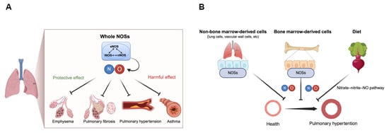 Diverse roles of NOSs in respiratory diseases (A) and impact of NOSs in different cell types and dietary nitrate in pulmonary health (B). (A) Schematic diagram showing the diverse roles of NOSs in respiratory diseases. NOSs play a protective role in the pathogenesis of spontaneous pulmonary emphysema, pulmonary fibrosis, and pulmonary hypertension, whereas they play a harmful role in the pathogenesis of asthma. (B) Schematic diagram indicating the impact of NOSs in different cell types and dietary nitrate on pulmonary health. NO derived from NOSs in non-bone-marrow-derived cells, such as lung cells and vascular wall cells, elicits vasodilation and reduces pulmonary vascular resistance, preventing pulmonary hypertension; NO derived from NOSs in bone marrow cells inhibits pulmonary vascular remodeling, preventing pulmonary hypertension; and NO converted from dietary nitrate (e.g., a beetroot, lettuce, and spinach) via the nitrate–nitrite–NO pathway provides an alternative source of NO, maintaining pulmonary health and protecting against the development of pulmonary hypertension.
